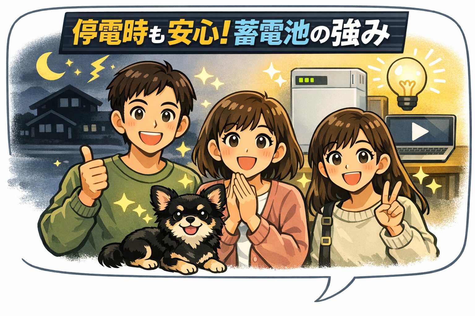 今回のブログ記事では、太陽光発電に加え、蓄電池があることによって、停電対策(安心感)が格段とアップすることについて、具体的に説明するだワン。
